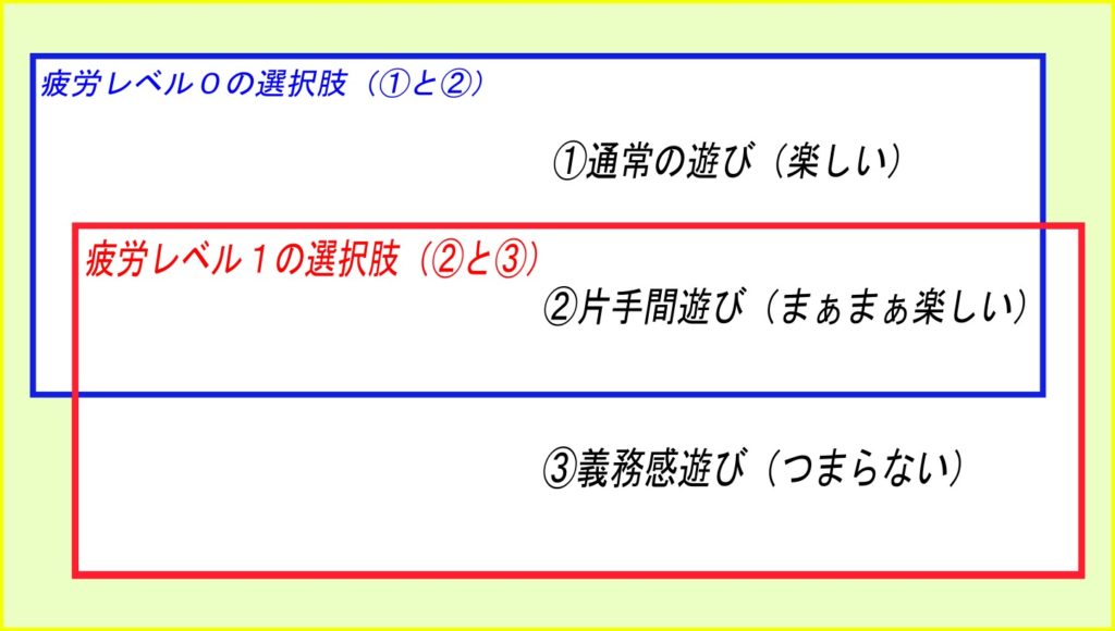 赤い線で囲まれている「疲労レベル1の選択肢(②と③)」に、通常の遊びは入っていません。